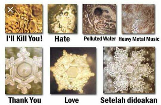 Air yang diberi rangsangan dengan pengucapan kata “cinta” menghasilkan bentuk kristal segi enam yang cantik, yang biasa disebut heksagonal. Heksagonal ini baik untuk sel tubuhmu di dalam darah, karena bentuk heksagonal akan menjebak oksigen lebih banyak. Air dengan kandungan heksagonal ini sering digunakan dalam metode pengobatan menggunakan wadah air. Sebaliknya, air dengan rangsangan pengucapan kata “mengumpat” atau “cercaan” menghasilkan bentuk yg abstrak dan cenderung jelek. (Dih.. jelek)