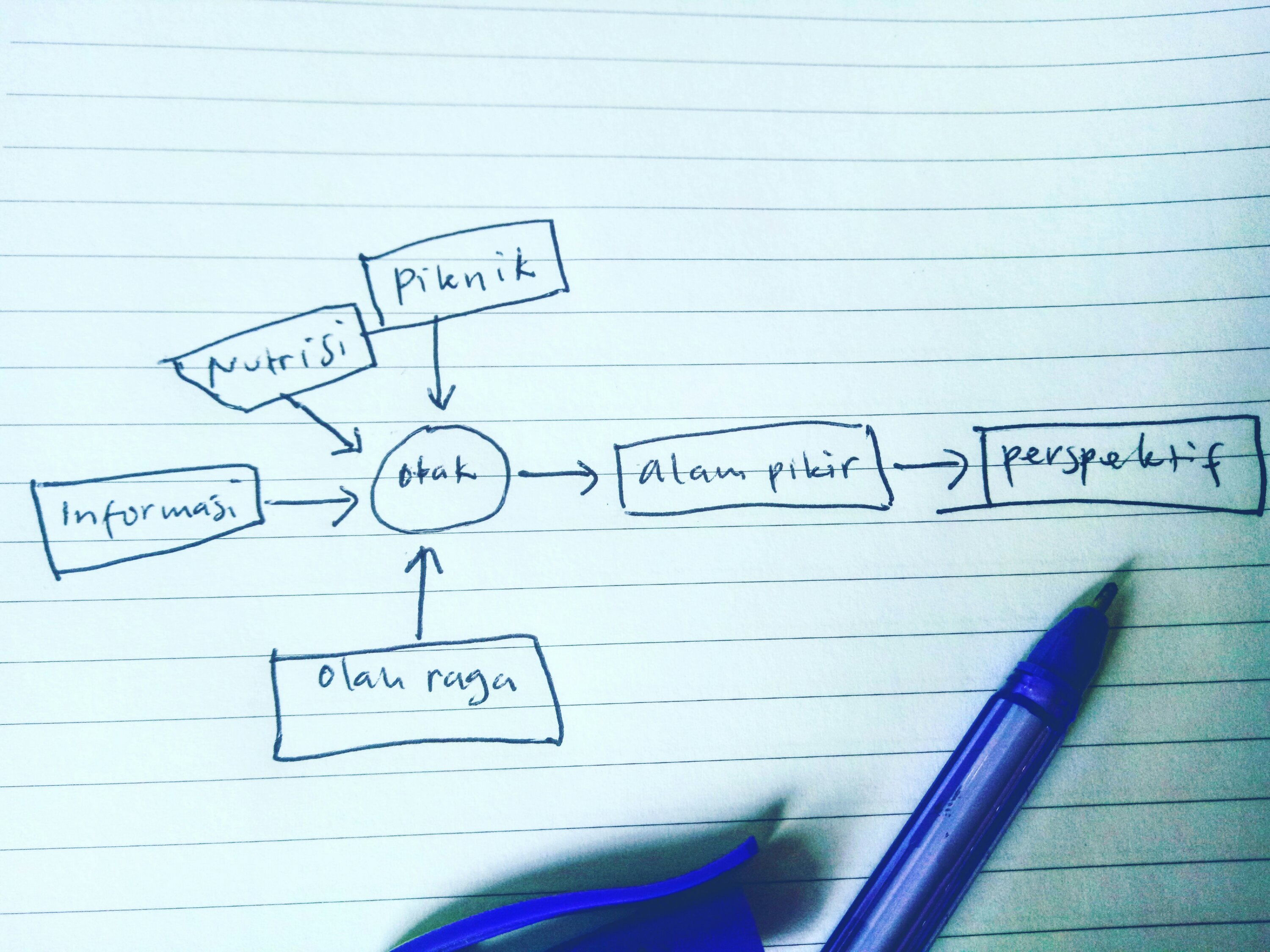 Sementara itu alam pikiran adalah akumulasi informasi yang berhasil diserap otak. Sedangkan otak manusia berkembang memerlukan beberapa aspek, di antaranya; asupan nutrisi, olah raga yang teratur dan selebihnya dibutuhkan piknik yang cukup. Jadi, jika dibuat alur prosesnya, perspektif itu muncul kira-kira akan seperti ini;
