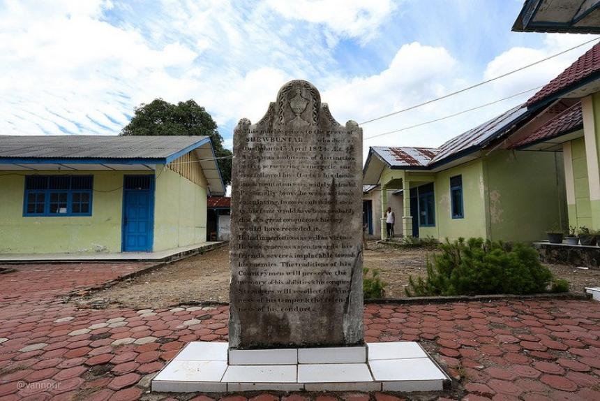 Prasasti Shewbuntar yang ditulis dalam bahasa Inggris.